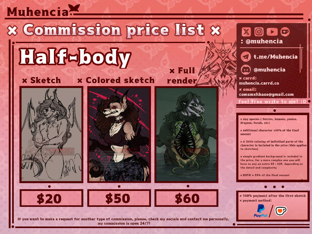 My commission is open 24/7. The price list is just below, and my adopts are on Ping Commishes, Fur Affinity or my Ko-fi. I would be damn happy for any support, and let me know if you are interested, feel free to contact me on my discord, mail, or my other socials, I will be happy :]
